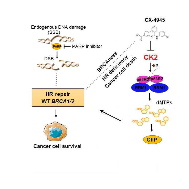 然而,携带BRCA1/2突变在卵巢癌或乳腺癌患者不到30%,大部分BRCA1/2野生型的卵巢癌患者对PARP抑制剂不敏感。陈果教授团队首次报道,核糖核苷酸还原酶小亚基p53R2在肿瘤中高表达,并可通过调控CtIP稳定性影响同源重组修复。本研究进一步发现,酪蛋白激酶II (CK2)可通过磷酸化p53R2 (Ser20)位点,促进核糖核苷酸还原酶的组装与活性发挥,从而保证同源重组修复所需的dNTPs原料供给。因此,靶向CK2可通过抑制BRCA1/2野生型肿瘤细胞同源重组修复因子CtIP表达及dNTPs原料合成,增强BRCA1/2野生型肿瘤细胞对PARP抑制剂的敏感性。综上所述,本研究揭示了一种抑制同源重组修复的新途径,为PARP抑制剂在BRCA1/2野生型癌症患者治疗中的应用提供了一种全新的策略。